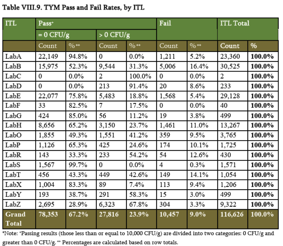 Notable for their absence from Dr. Johnson’s public presentation were several graphs and tables which, in the full report, break down test results by Independent Testing Lab (ITL). Such breakdowns can be suggestive, because they may show that some labs record systematically higher levels of THC than others, or fail fewer samples.