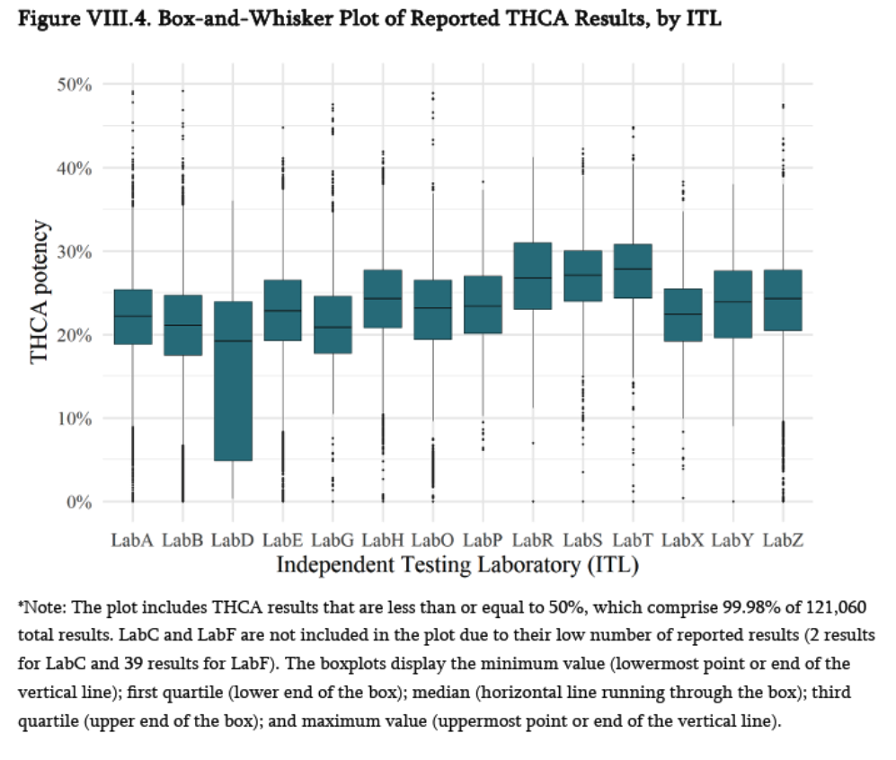The report’s Figure VIII.4 gives a box-and-whisker plot that shows that a few labs’ reported THCA values averaged 5 percent higher than the average over all labs for the time frame concerned. Table VIII.9 shows that one lab managed to record only four TYM failures out of 1,571 tests during the time frame concerned–a 0.3 percent rate of failure. It’s hard to understand why these results from the full 2025 Industry Report were left out of the slides shown at the February 25 public meeting.