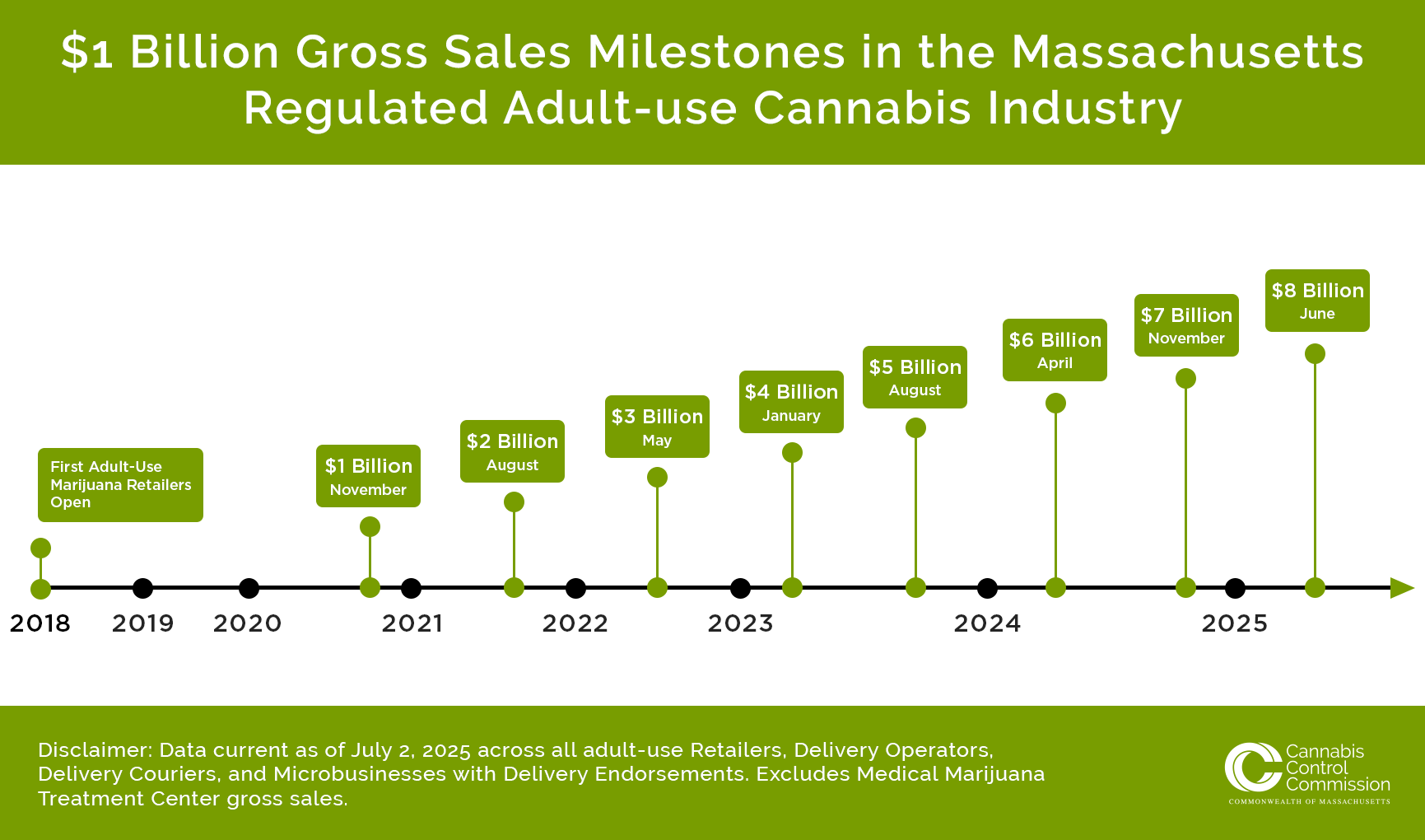 The Massachusetts Cannabis Control Commission (Commission) announced today that adult-use Marijuana Establishments surpassed $8 billion in gross sales after a record-breaking first half of 2025, according to sales data published to the agency’s Open Data platform.