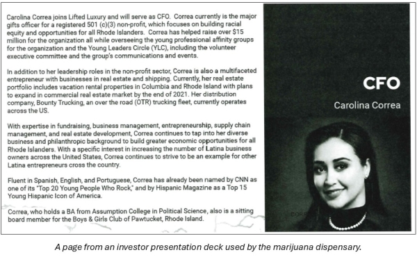 Specifically, “Correa contacted a friend who was opening a marijuana dispensary in Massachusetts and seeking investors. Correa agreed to seek out investors in the dispensary and in exchange, she would get an ownership stake and the title of CFO of the marijuana dispensary.”
