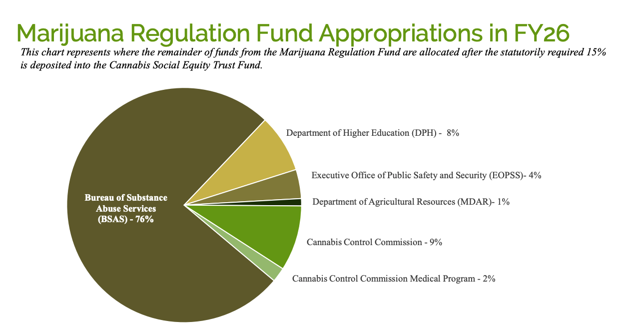 By statute, 15% of Marijuana Regulation Fund money goes to support the Cannabis Social Equity Trust Fund. After that, 8% goes to the Department of Higher Education, 4% to the Executive Office of Public Safety and Security, 1% to the Department of Agricultural Resources, and a massive 76% to the Bureau of Substance Abuse Services.