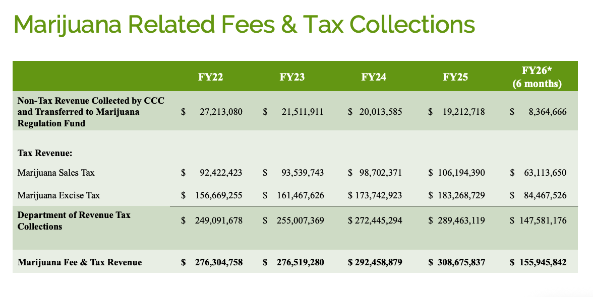 In FY25, the non-tax revenue collected by the CCC and transferred to the Marijuana Regulation Fund was just over $19 million. That’s largely from operator licensing fees. Then there is revenue from the state’s marijuana sales tax, plus the marijuana excise tax, the sum of which was nearly $290 million last fiscal year. In total, that’s more than $308 million—from weed!