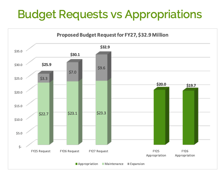 “FY26 Funding received was $3.1M below the Maintenance funding that was requested. Payroll costs were reduced $3M by freezing 11 positions, delays in hiring and delays in implementation of COLA increases. No expansionary funding was available to allocate to upgrade IT systems or Public Education Initiatives; [Social Equity] Program funding was reduced.”